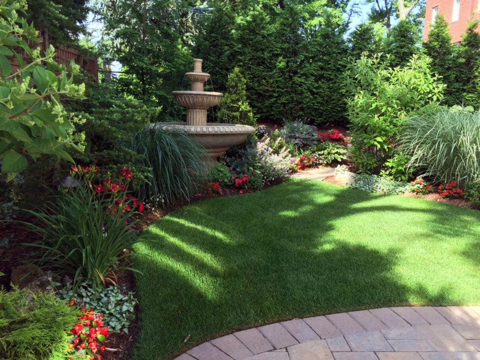 All plants were installed along with fresh new soil around the rootball to ensure proper plant development. A thick layer of cedar mulch was then applied to the plant beds for a beautiful, neat finish that would minimize weed growth. Mulch is visually appealing, healthy for plants, naturally repels insects, promotes soil microorganisms and retains moisture. A mix of fresh soil, fertilizer and peat moss was laid down where the lawn was to be created. Sod rolls were cut with precision to form neat, smooth curves, then packed tightly together for a beautifully carpeted lawn.